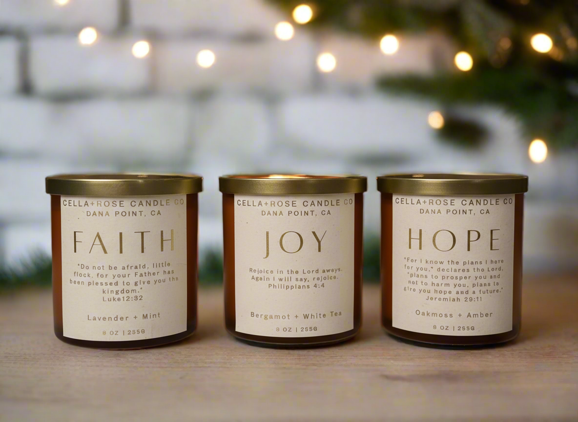 Illuminate your home and fill your space with beautifully crafted candles from our Guiding Light collection. Our candles bring HOPE, FAITH, and JOY into your home, creating a warm and welcoming atmosphere. We understand the challenges of life and have found solace in our FAITH in Jesus Christ. Through him, we have found HOPE and even in the midst of difficult times, we can find JOY. Remember to always "rejoice in the Lord" and trust in His perfect timing.